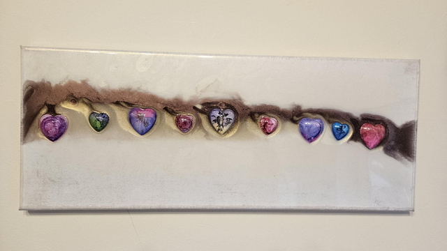 True Love is a handcrafted resin wall artwork symbolising connection, individuality, and the beauty of shared journeys. A flowing band of soft neutrals and metallic gold runs across the canvas, carrying a line of unique heart details — each one different, yet perfectly placed together.